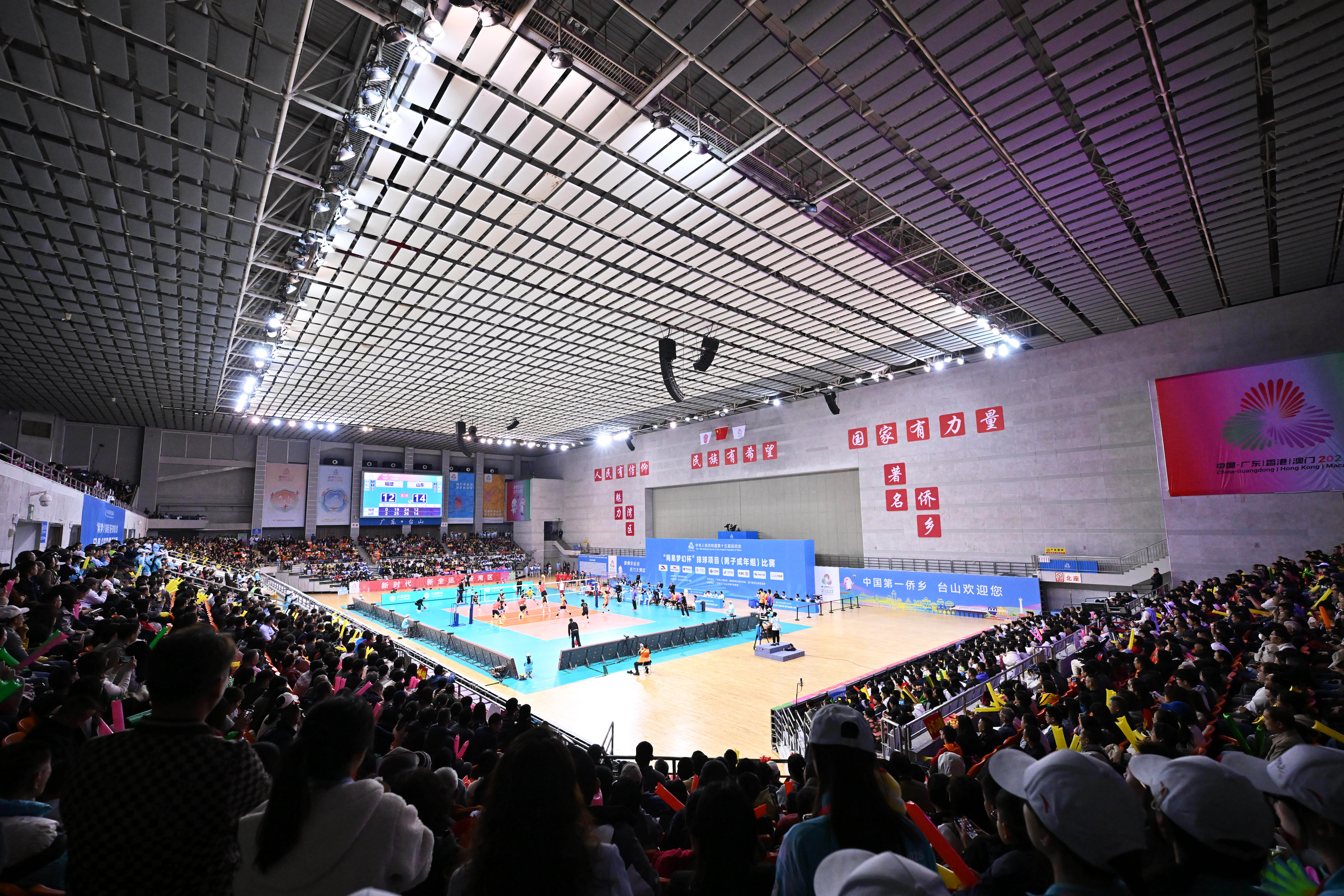 这是2025年11月20日拍摄的在广东江门举行的第十五届全国运动会排球男子成年组冠亚军决比赛现场。新华社记者 李鑫 摄