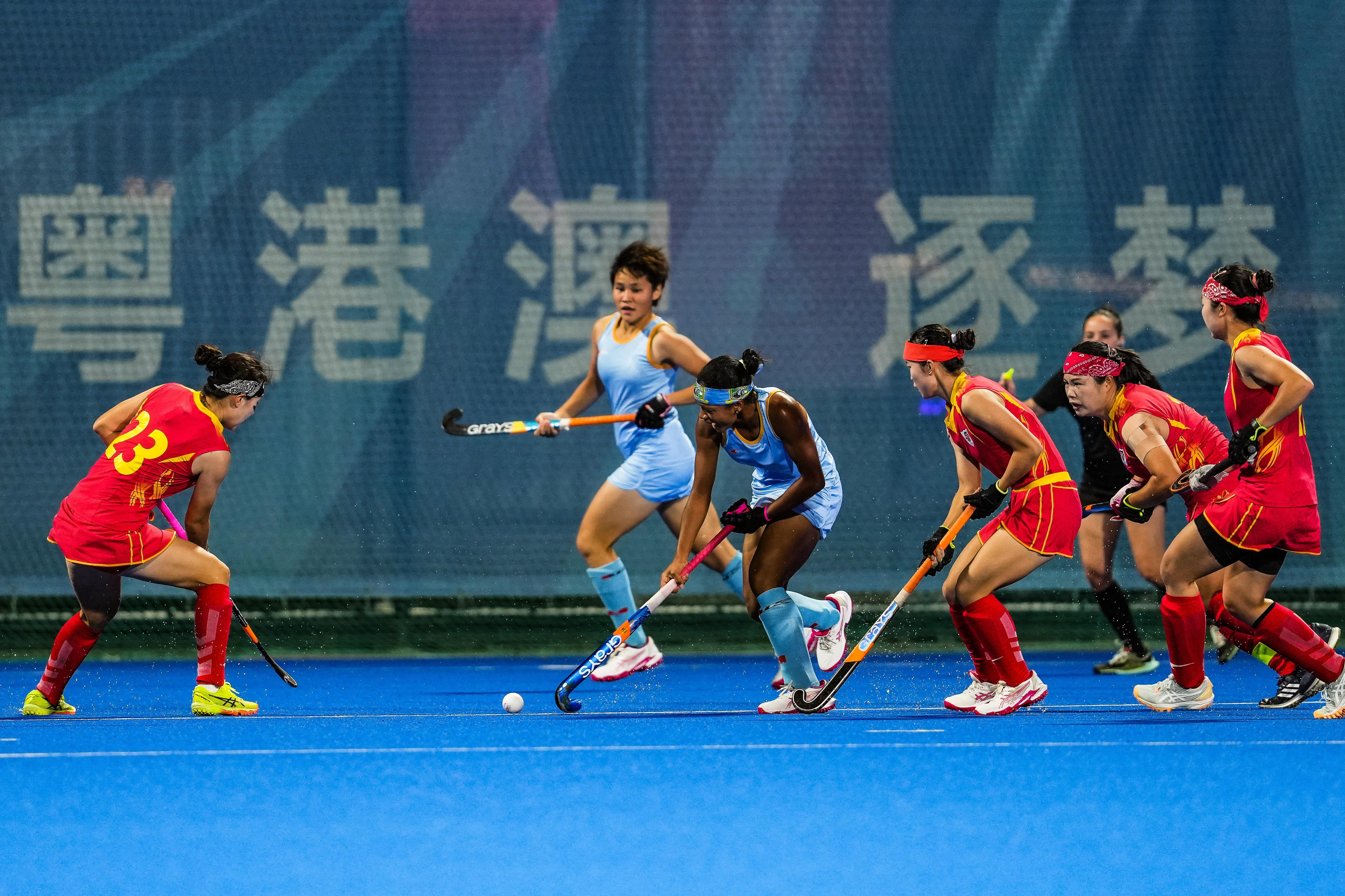 2025年11月10日,重庆队球员罗亚西(左三)在广东云浮举行的第十五届全国运动会女子曲棍球四分之一决赛中进攻。新华社记者 陶亮 摄