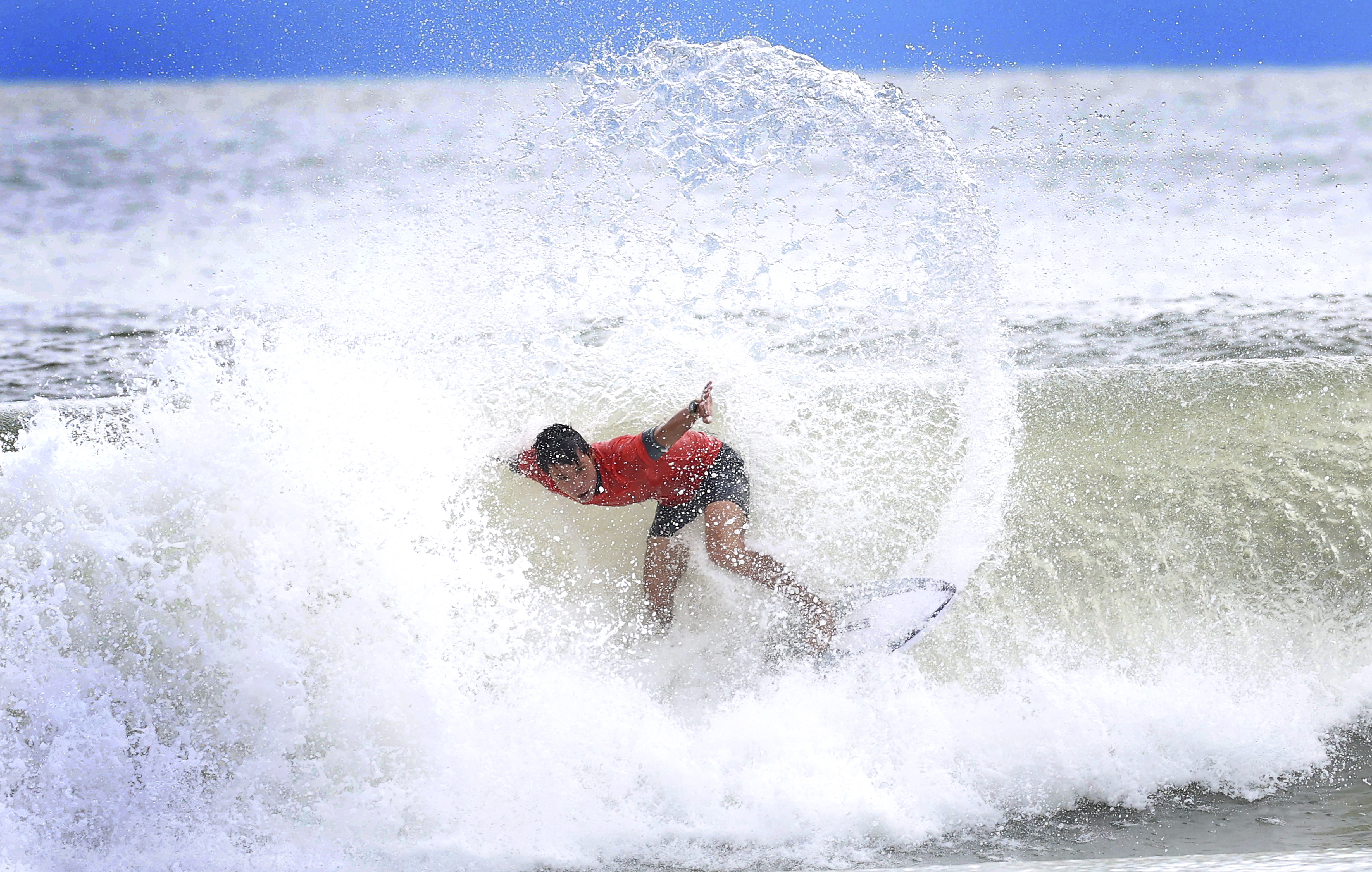 2025年11月13日,福建队选手陈丙寅在广东汕头举行的第十五届全国运动会冲浪男子短板第一轮比赛中。新华社记者 卢汉欣 摄