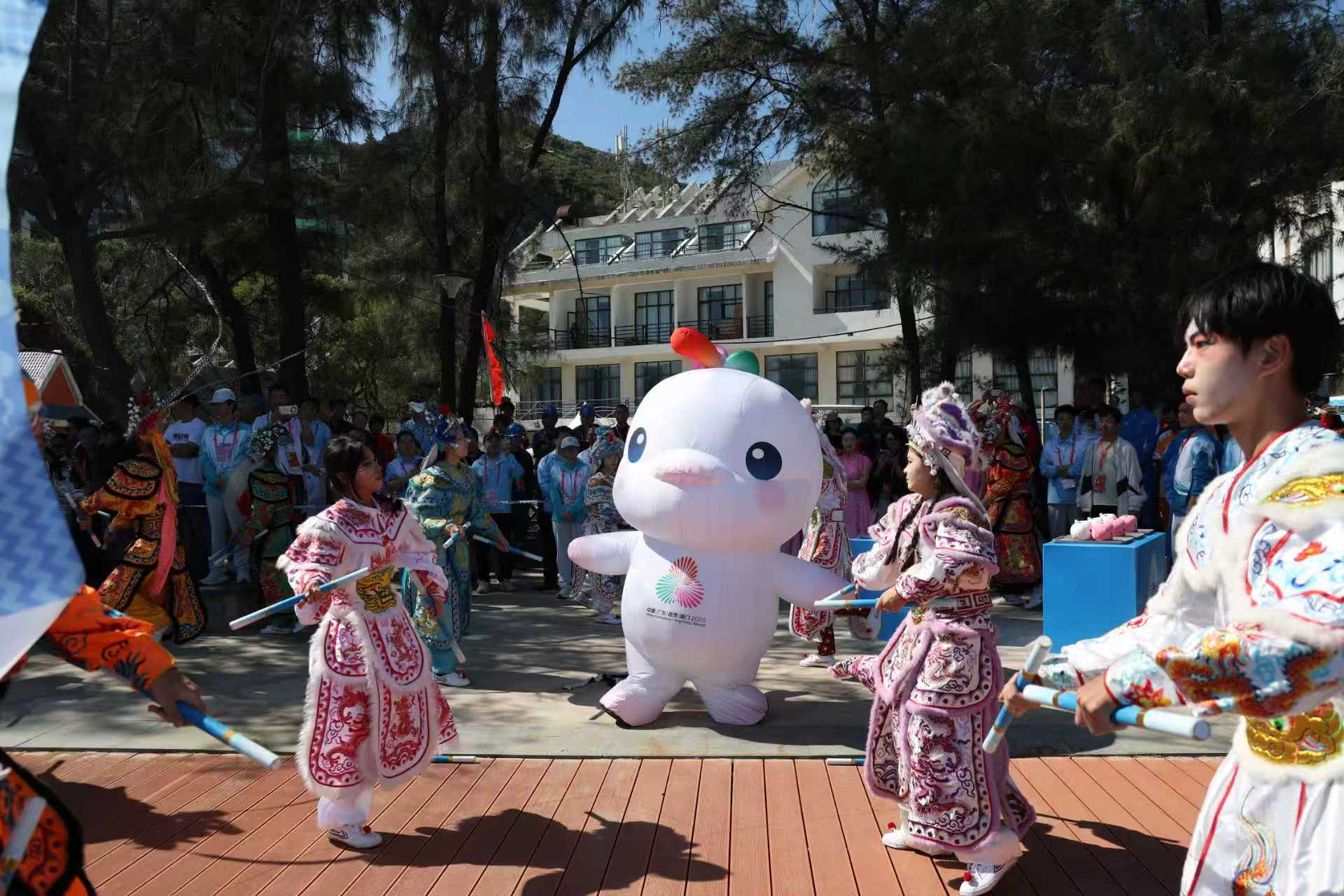 2025年11月16日,在第十五届全国运动会冲浪比赛颁奖仪式上,英歌舞和十五运吉祥物共舞。新华社记者 卢汉欣 摄
