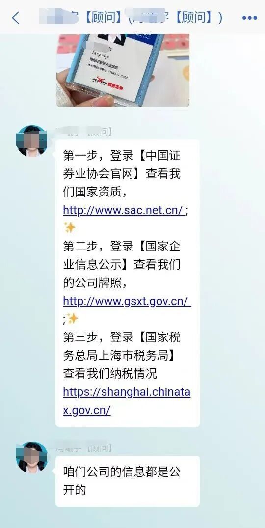 根据吴阿姨提供的工牌、聊天截图资料,记者向西部证券官方客服核实冯姓顾问身份时,工作人员查询后表示确实有这名员工,但她日常在西部证券总部上班,不可能跨区从事湖北省的业务。“按照规定,证券公司从业人员信息都在中国证券业协会官网上公布,名字、证件号是公开的,别人可能把这些信息粘贴到自己的照片上,伪造身份骗人。”